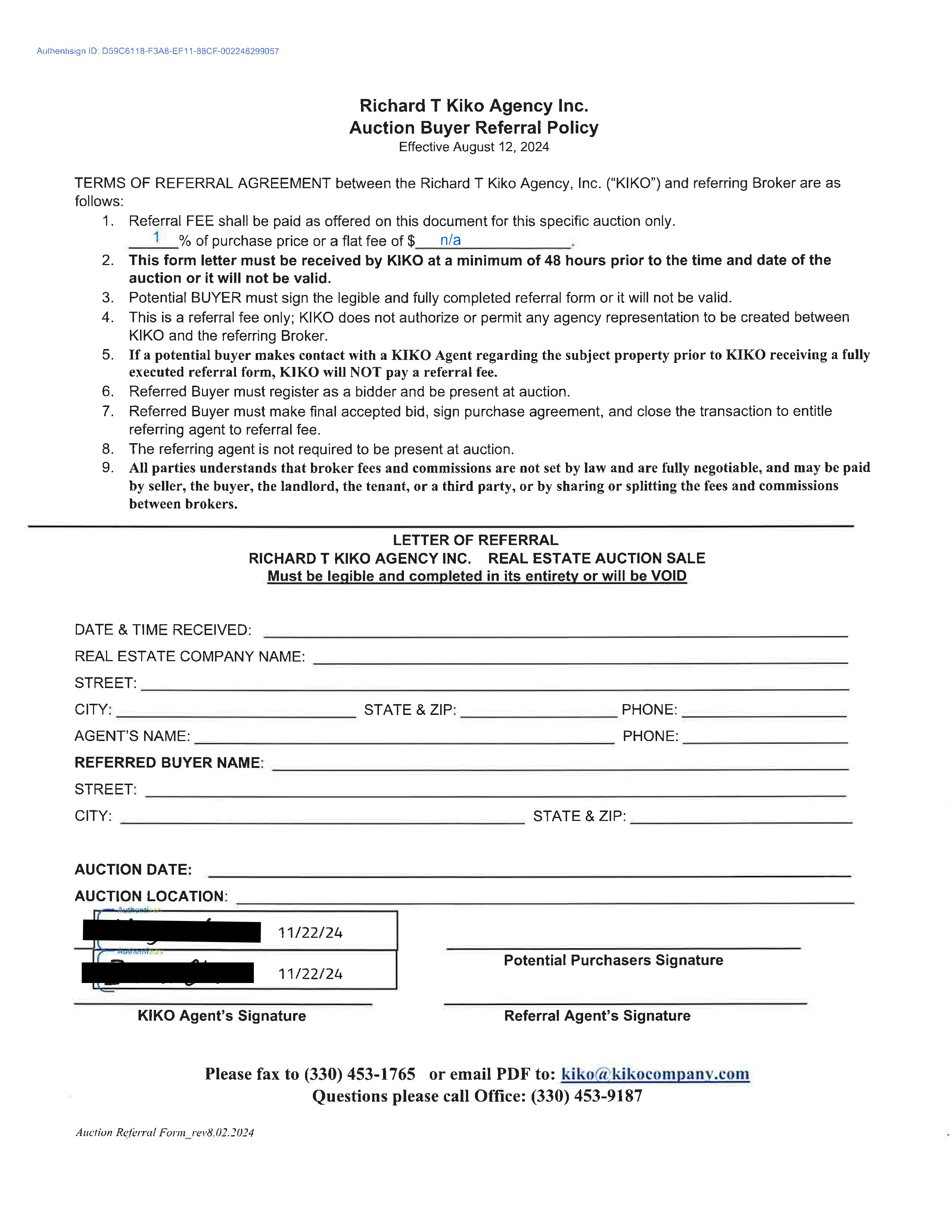 10% down auction day, balance due at closing. A 10% buyer’s premium will be added to the highest bid to establish the purchase price. Any desired inspections must be made prior to bidding. All information contained herein was derived from sources believed to be correct. Information is believed to be accurate but not guaranteed.